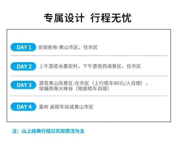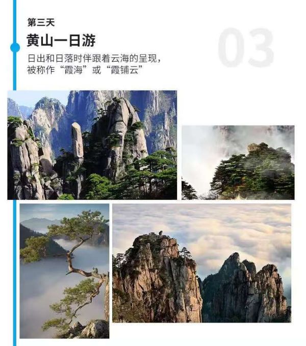 酒店接客人后出发,车赴黄山风景区换乘中心,换乘【景区交通车】至云谷寺(大约30分钟),步行【或自愿自费乘云谷缆车(单程80元/人次自理)】至白鹅岭索道站,游览【黄山风景区】(备注:黄山登山游览路线可逆行,根据当日客情而定),游览始信峰:观连理、龙爪、探海、卧龙等十大名松;童子拜观音、十八罗汉朝南海、猴子观海等巧石群;经慧明桥游北海景区观梦笔生花、散花坞、笔架峰等景点;经团结松到西海排云亭观景台处观赏:仙人晒靴、武松打虎等巧石。