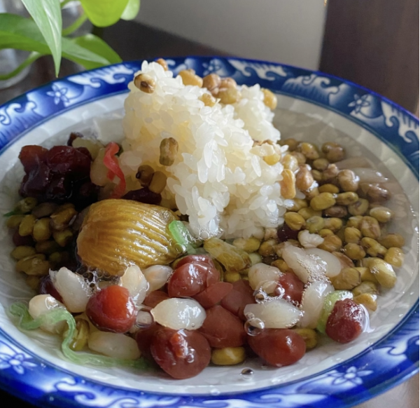 以新鲜绿豆和圆糯米为主料,搭配冬瓜糖、蜜枣、红绿丝等蜜饯,浇上用薄荷叶或薄荷精调制的清凉糖水,还可加冰块。绿豆煮至开花,软糯香甜,糯米绵密,蜜饯酸甜,与薄荷水的沁爽完美融合,一口入喉,凉意瞬间驱散暑气。