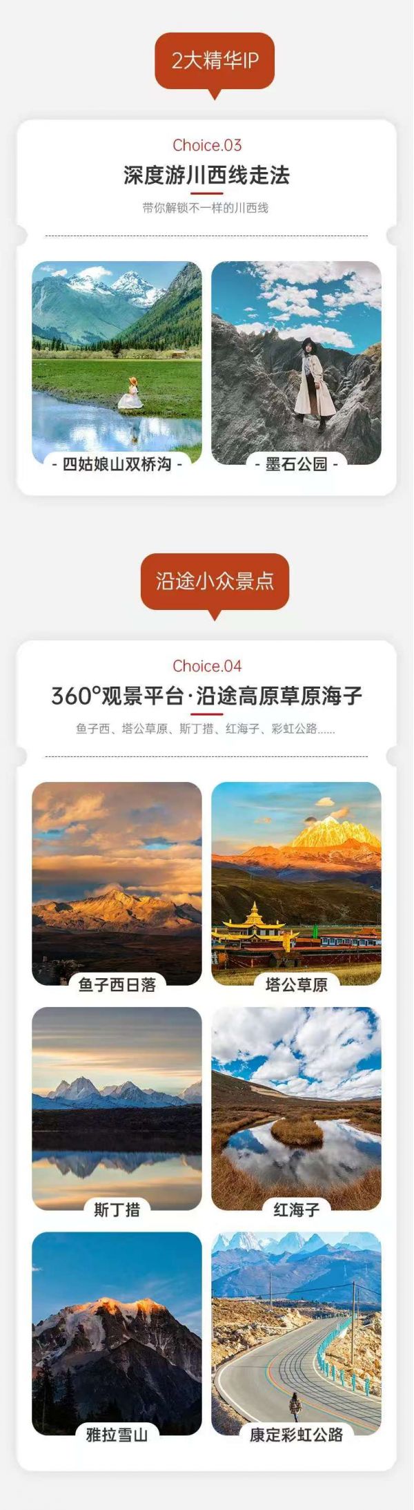 因双桥沟有限流要求,如遇票满,我们将更换安排海子沟和长坪沟的门票,以上两个景点也同属四姑娘山。