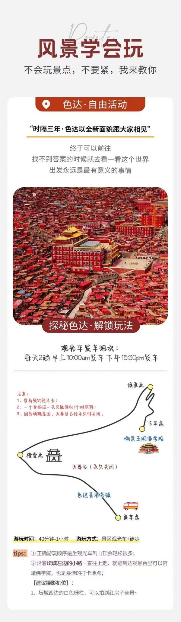 ①色达均是预约进入,统一观光车参观游览。