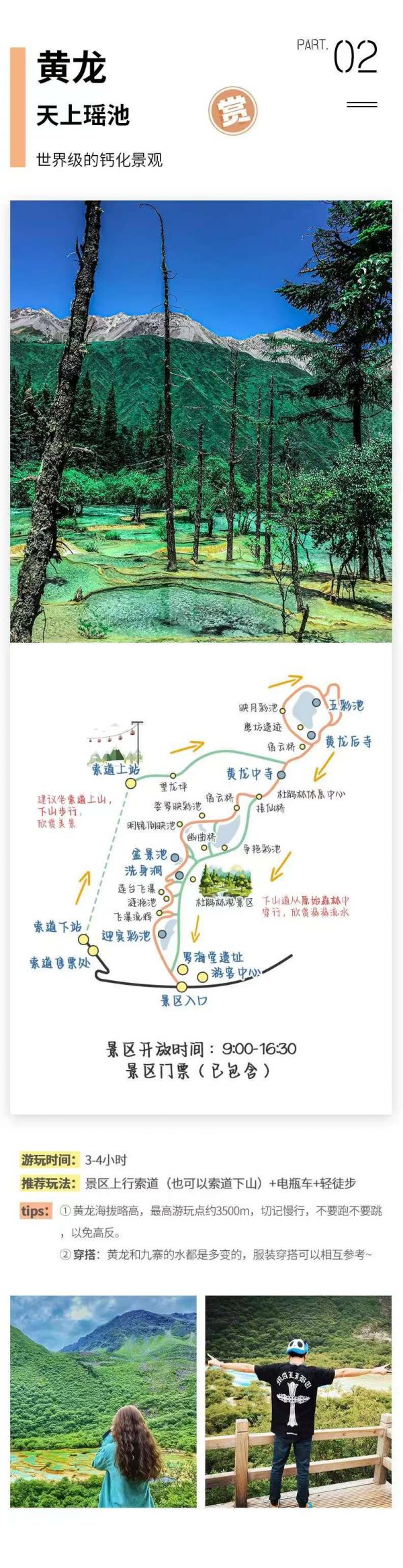 黄龙风景区(门票已含,游览时间约4小时);建议最佳游览方式:索道上山--穿越原始森林--步行游览五彩池--五彩池步行下山;(黄龙冬季索道或因检修停运,需步行上下山,请量力而行)