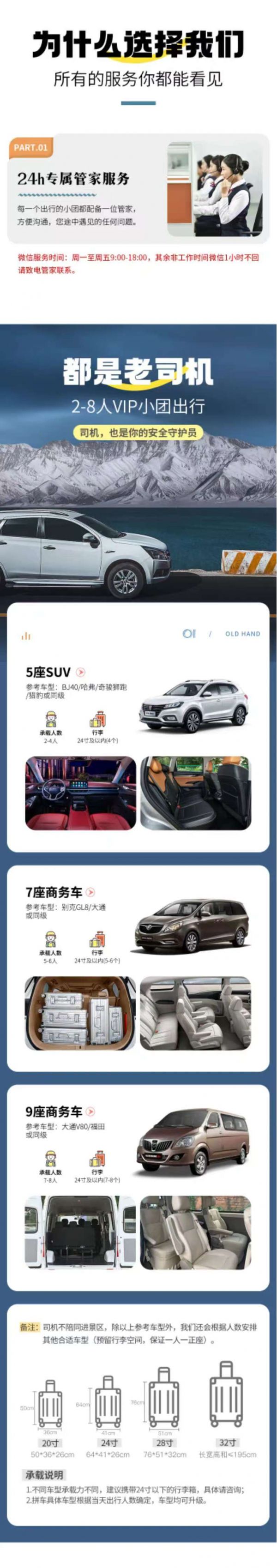 为保证成团及质量,根据人数派不同座位数用车,保证每人一正座;若遇资源紧张,会安排其他车型:包括但不限于5-7/9座或12-19座等正规旅游用车,车型均不接受指定,敬请谅解!