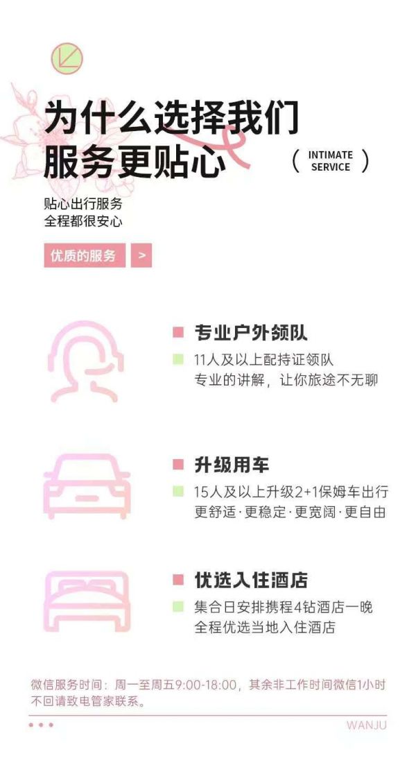 为保证成团及质量,根据人数派不同座位数用车,保证每人一正座;