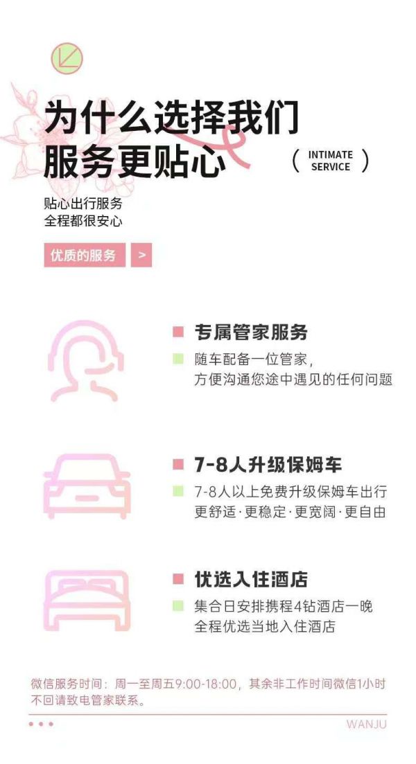 为保证成团及质量,根据人数派不同座位数用车,保证每人一正座;