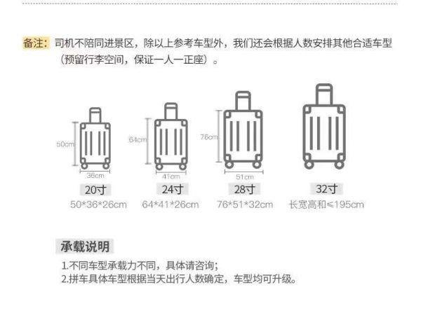 备注:车型承载力有限,携带行李为24寸或以下行李箱。