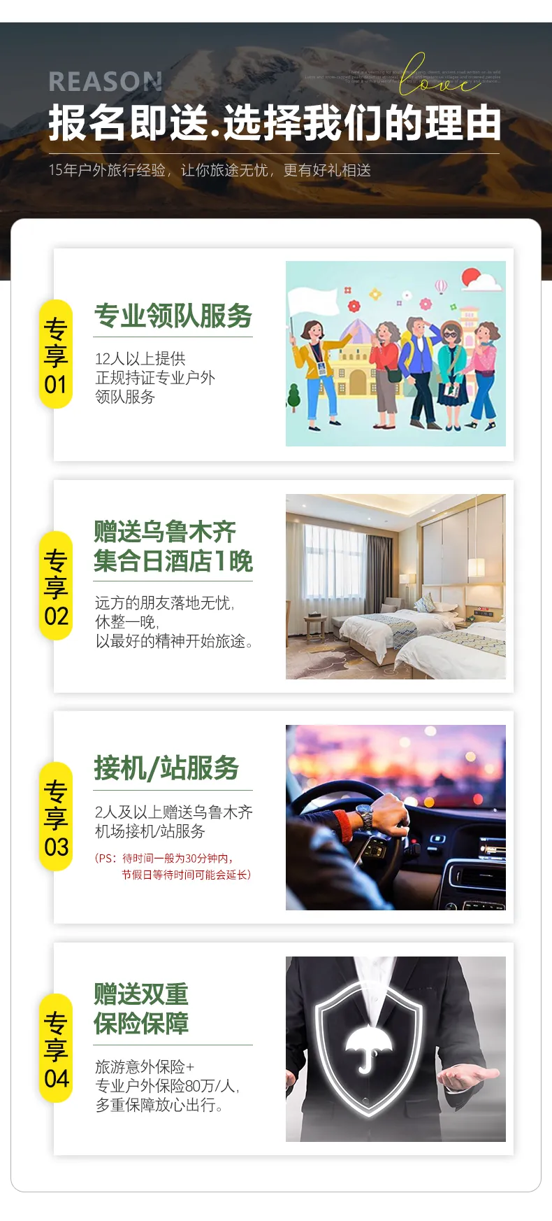 接机站服务:本次活动提供乌鲁木齐市内24小时接机/接站服务,工作人员会在您出发日期前一天21:30之前向您推送消息并与您联系,如果超过时间没有接到任何通知,请及时与报名处联系。(接站等待时间一般为15-20分钟,最长不超30分钟,节假日拼单人数较多情况下客人等待时间可能会延长)。