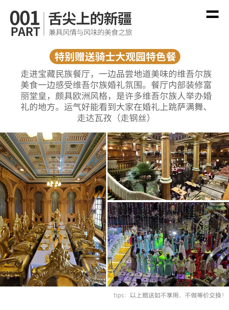 晚上驱车到达喀什,今晚大家可以进到颇具新疆特色的骑士大观园餐厅,品尝新疆特色美食。这个宝藏民族餐厅,内里装修金碧辉煌,因此很多维吾尔族人会选择这里举行婚礼。如果足够幸运,我们可以见证维吾尔族人的婚礼,并欣赏他们在婚礼上表演歌舞。