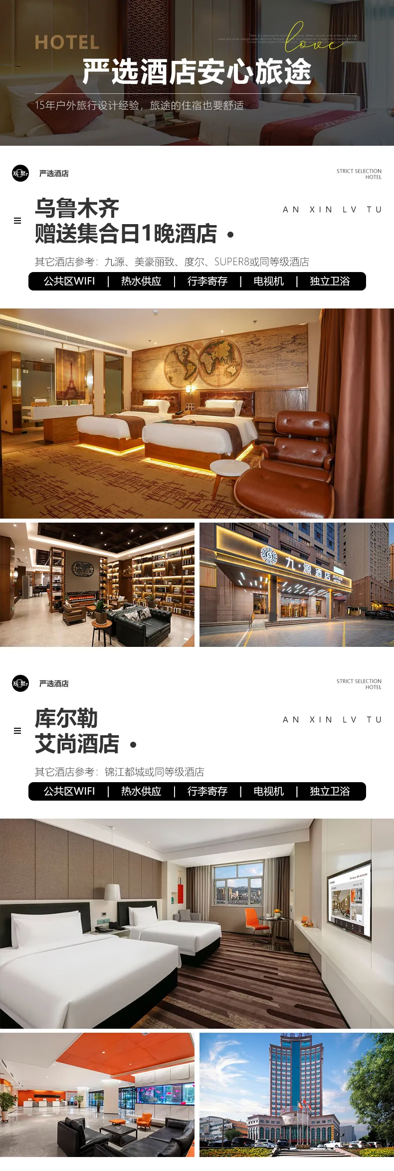 住宿:行程所列7晚住宿。我们会提供行程内展示照片的酒店或其他条件相似酒店,但因沿途条件有限,如酒店设施达不到您的期望,请您谅解。参考酒店如下:
