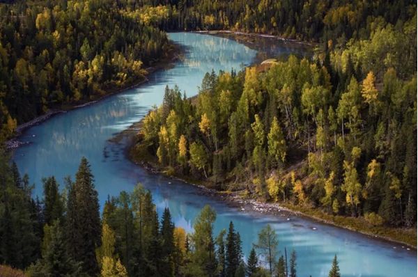 在喀纳斯,各式湖泊绝对是必访景点,湖底高低差加上光线的影响,总能给你意料之外的惊喜。而其中凭借地貌而走红的当属月亮湾,每到秋冬季节这儿挤满了前来拍照的人。