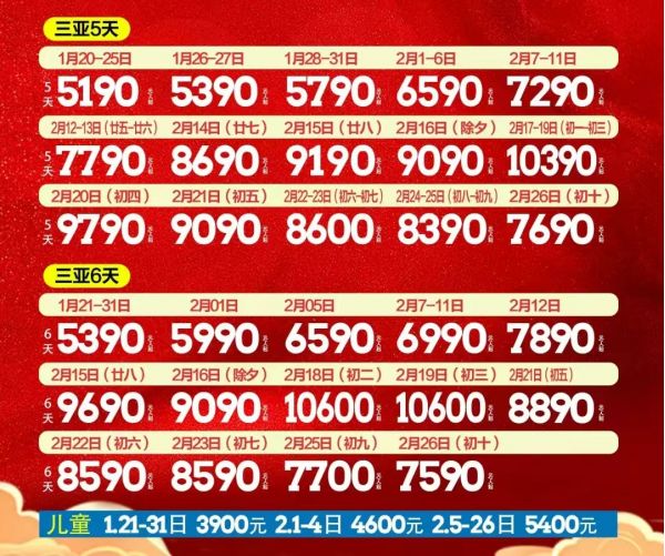 出团日期:五天:1月20-25日1月26-27日1月28-31日2月1-6日2月7-11日2月12-13日(五-)2月14日(廿七)2月15日(廿八)2月16日(除夕)2月17-19日(初一初三)2月20日(初四)2月21日(初五)2月22-23日(初六一初七)2月24-25日(初八一初九)2月26日(初十) 六天:1月21-31日2月01日2月05日2月7-11日2月12日2月15日(廿八)2月16日(除夕)2月18日(初二)2月19日(初三)2月21日(初五)2月22日(初六)2月23日(初七)2月25日(初九)2月26日(初十)