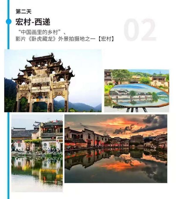 早上:08:00-08:30 各酒店接客人后出发, 酒店早餐后乘车前往 “中国画里的乡村”、影片《卧虎藏龙》外景拍摄地之一【宏村】,游览约2小时。湖光山色与层楼叠院和谐共处,自然景观与人文内涵交相辉映,是宏村区别于其他居民建筑布局的特色,从整个外观上说,宏村是古黟桃花源里一座奇特的牛形古村落,背倚黄山余脉羊栈岭、雷岗山等,地势较高,有时云蒸霞蔚,如浓墨重彩,有时似泼墨写意,四周山色与粉墙青瓦倒映湖中,好似一幅徐徐展开的山水画卷,吸引了众多爱好写生、摄影者及影视作品纷至沓来。宏村整个整个村落占地30公顷全村现完好保存明清民居140余幢,承志堂“三雕”精湛,富丽堂皇,被誉为“民间故宫”。
