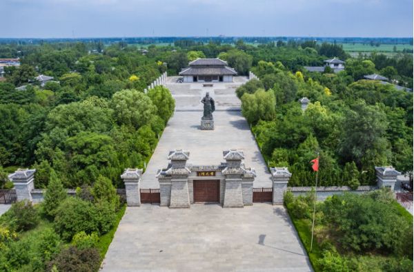 后游览【蚩尤陵】,蚩尤陵位于山东省聊城市阳谷县十五里园镇,是为纪念上古部落首领蚩尤而建的文化遗存,由首级冢与陵园组成。陵园由钱运选规划设计,占地105亩,中轴线分布陵门、蚩尤铜像(高10.8米)、祭坛等九座建筑 。据《汉书》《史记》等记载,蚩尤战败后首级葬于东平郡寿张县阚乡。