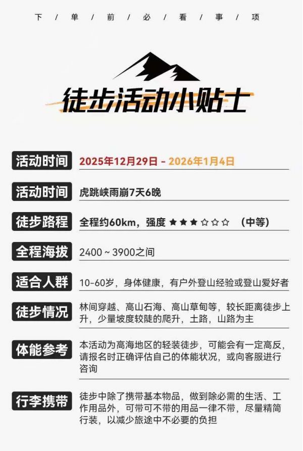 徒步路线较为偏远,条件有限,主办方有权根据具体房态进行调整
