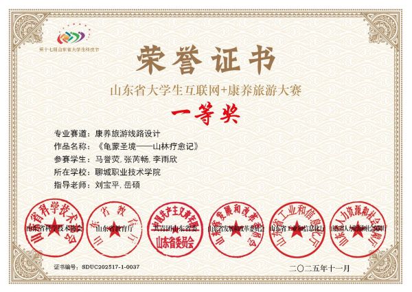 11月13日,第十七届山东省大学生科技节——山东省大学生互联网+康养旅游大赛获奖名单公示,在刘宝平、岳硕两位老师的指导下,聊城职业技术学院刘宝平师生工作室成员马誉荧、张芮畅、李雨欣凭借“康养旅游线路设计”作品脱颖而出,成功摘得赛事一等奖。