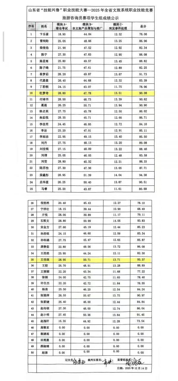 12月14日,2025年山东省“技能兴鲁”职业技能大赛全省文旅系统旅行社咨询员赛项圆满落幕。本次赛事聚焦文旅行业人才核心能力,吸引全省各地200余支参赛队伍同台竞技,聊城职业技术学院文旅学院学生表现亮眼,凭借扎实的专业功底、出色的创新思维与高效的实战能力脱颖而出,最终斩获一等奖1项、二等奖1项,充分展现了我校文旅专业人才培养的过硬成效。