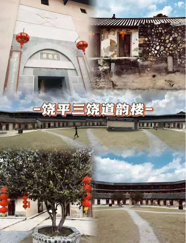 抵达后前往参观【道韵土楼】(必消套餐含门票)中国最大的客家土楼 ,楼体为最奇特的八卦造 型 。 八卦宇宙图式布局 :楼埕为太极 ,埕左右两公用 水井象征 “ 两仪 " (俗称 “ 阴阳鱼 ”) , 八面三进围屋像爻画,埕和屋内 的明沟暗涵寓 阴阳之合 。道韵楼居 民的祖辈 请勘 舆师择地建楼 ,勘 舆 师先到此地勘察 ,初 觉此地地理位置佳, 出于慎重考虑 , 又转 了几 十里路 ,察看几个地方 ,还 是觉得倒不如这个地方 好 , 又倒 回来 , 潮州 话叫做 “ 倒运 ” 。 后来起名字时 , 借 “ 倒运 ” 的谐音 , 就叫 “ 道 韵楼”。