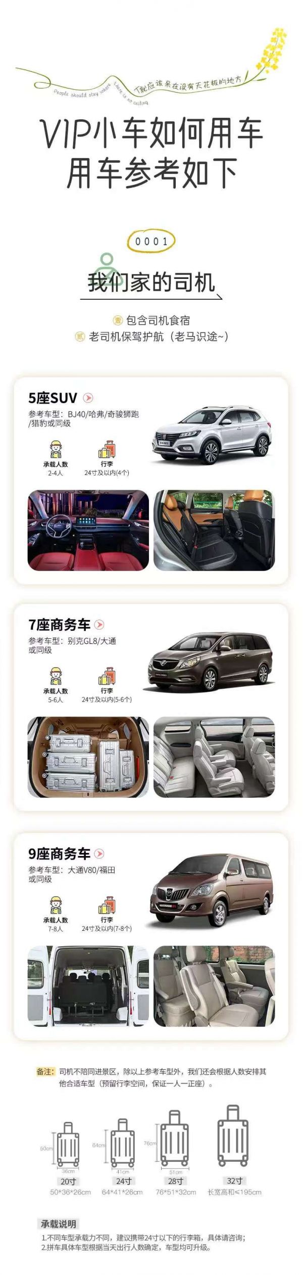 备注:车型承载力有限,携带行李为24寸或以下行李箱。
