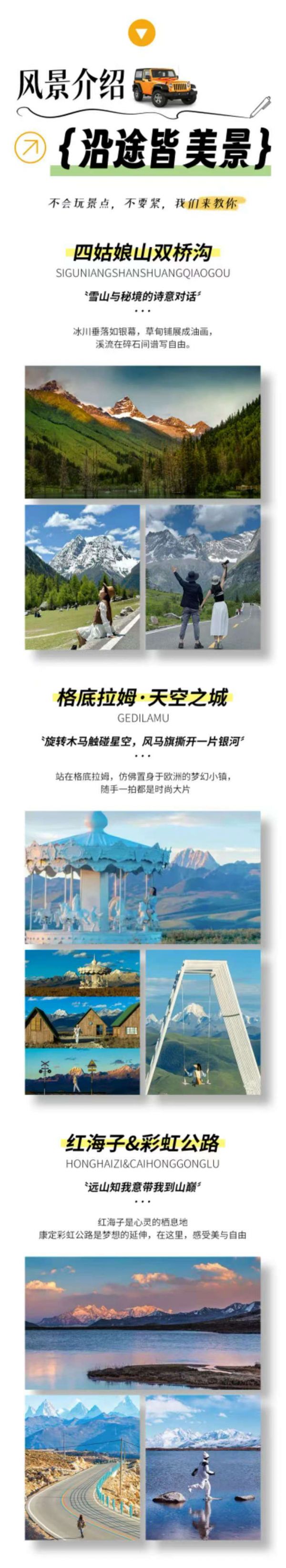 冷措哈:或许是一个美丽的湖泊,湖水清澈,周围的自然环境优美,可能是观赏雪山倒影的好地方。虫草:所在区域可能有独特的生态环境,也许能了解到虫草的生长环境和相关知识,同时周围的自然风光也可能别具一格。提弄:可能相对较为小众,但也有着自己独特的风景和特色,等待你去探索发现。空中花园(垭口近观贡嘎雪山):在这个垭口可以近距离观赏贡嘎雪山,周围的景色如诗如画,仿佛置身于空中花园一般。站在垭口,能感受到贡嘎雪山的磅礴气势,让你为之震撼。游玩结束后,返回新都桥入住酒店。
