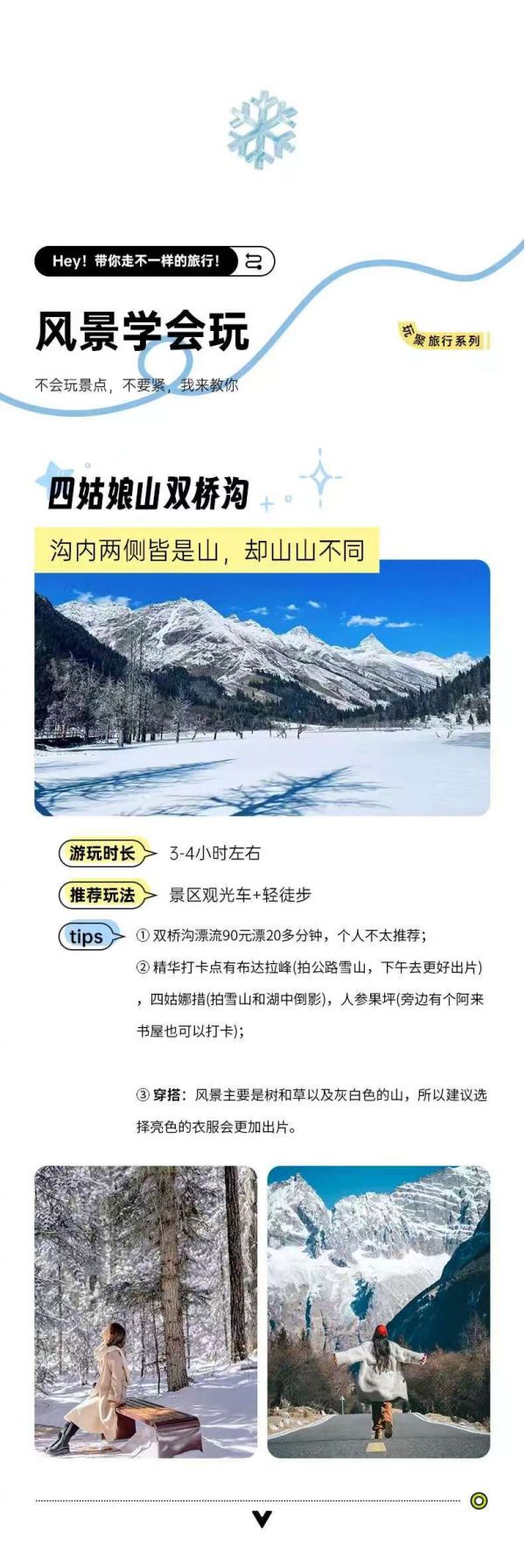 从都江堰出发,前往四姑娘山双桥沟。双桥沟内风景如画,有雄伟的雪山、幽深的峡谷、清澈的溪流和茂密的森林。乘坐观光车深入景区,沿途可以欣赏到各种美丽的自然风光。您可以在观景台下车,拍照留念,也可以徒步探索,感受大自然的宁静与美丽。游览完双桥沟后,返回成都散团,结束这段难忘的旅程。在这六天的时间里,您领略了四川的自然风光和人文魅力,带着满满的回忆和收获,踏上归程。回到聊城温暖的家。
