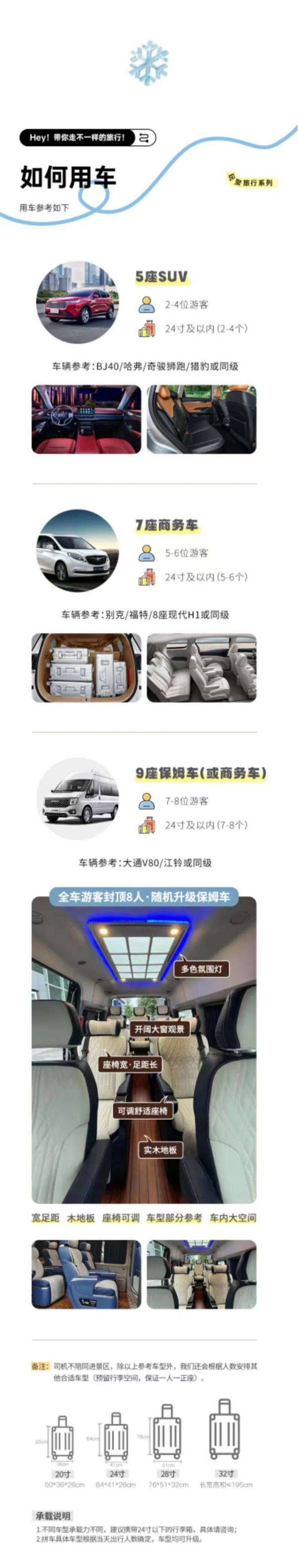 用车:2-8人VIP小团为保证成团及质量,根据人数派不同座位数用车,保证每人一正座;包含司机一名、油费、:过路费、停车费,包含从出发地到景点及酒店费用,不包含晚间自由活动交通;2-4位游客:乘坐5座SUV;5-6位游客:乘坐7座商务车;7-8位游客:乘坐9座商务车(或随机升级9座保姆车)备注:车型承载力有限,携带行李为24寸或以下行李箱。*随车随机配备无人机或单反(不指定);(节假日不保证团团配备)。