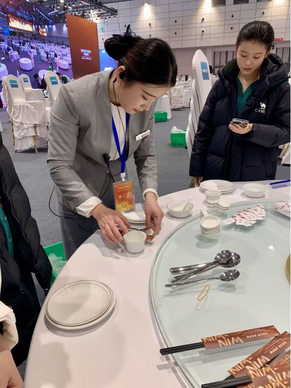置身这场紧张有序的“战役”,聊职文旅学子迅速融入高强度的服务节奏。他们穿梭在整齐排列的圆桌之间,配合前厅服务团队化身精准的“送餐员”,严格遵循宴会服务流程,高效完成传菜、摆台、宾客引导等各项工作。刘宝平师生工作室的王佳琪更是以扎实的专业功底,在实践中展现出良好的职业素养,成为学子中的亮眼代表。尽管展厅内寒意逼人,但学子们始终坚守岗位,用认真负责的态度赢得现场各方认可。