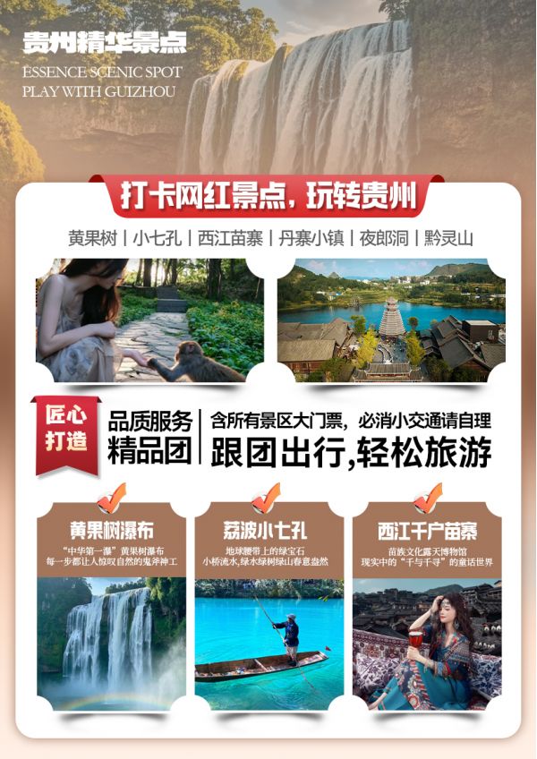 门票:含黄果树景区大门票、小七孔景区大门票、西江千户苗寨大门票、夜郎洞大门票