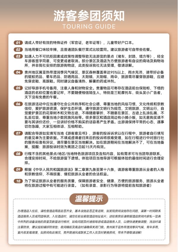 温馨提示:当天导游会以短信或电话形式通知次日出行时间和注意事项,请保持手机畅通。