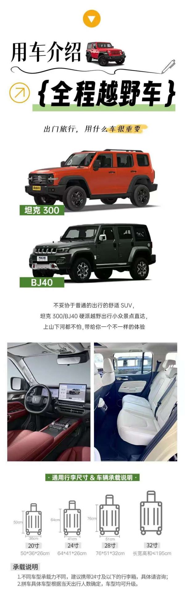 备注:车型承载力有限,携带行李为24寸或以下行李箱。