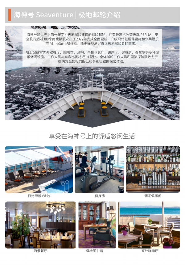 1. 象征勇气、冒险精神与极限征服的探险之旅。在天气和冰情允许的情况下,海神号将在探险队长与船长的带领下 ,跨越 66°33’南极圈,进入更深入的极地世界。
