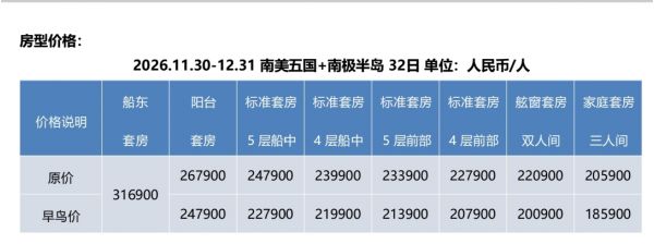 早鸟价: 除船东套房外,其他房型早鸟价立减 2 万元/人,优惠截止于 2026/2/28备注: 6人起发,10人起派领队,需自备美签