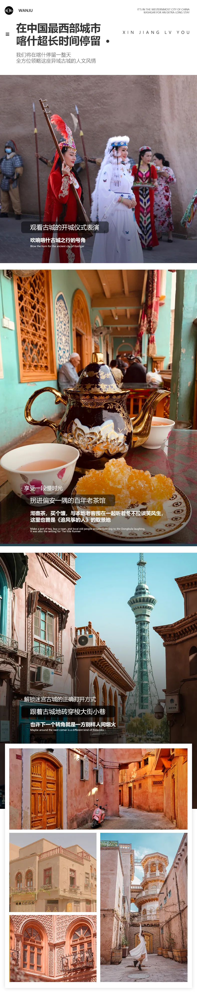 今天我们将去到中国最西部的城市—【喀什】,用整整一天的时间去领略这个“你未曾前往,但始终向往”的城市魅力。来喀什必须要逛逛【喀什古城】,喀什老城每天有两个开城仪式表演,时间分别是:早晨10:30 下午18:00,向来自五湖四海的朋友们展示自己热情的好客之道。之后我们进入古城漫步在古城的街道,老城区街巷纵横交错,布局灵活多变,曲径通幽,民居大多为土木、砖木结构,不少传统民居已有上百年的历史,是中国以伊斯兰文化为特色的迷宫式城市街区。这里巷道狭窄弯曲,奇特的过街楼、小胡同、手工作坊随处可见,生土建筑比比皆是,被中外游客誉为“维吾尔族活的民俗博物馆”,是喀什这座中国历史文化名城的内涵所在。