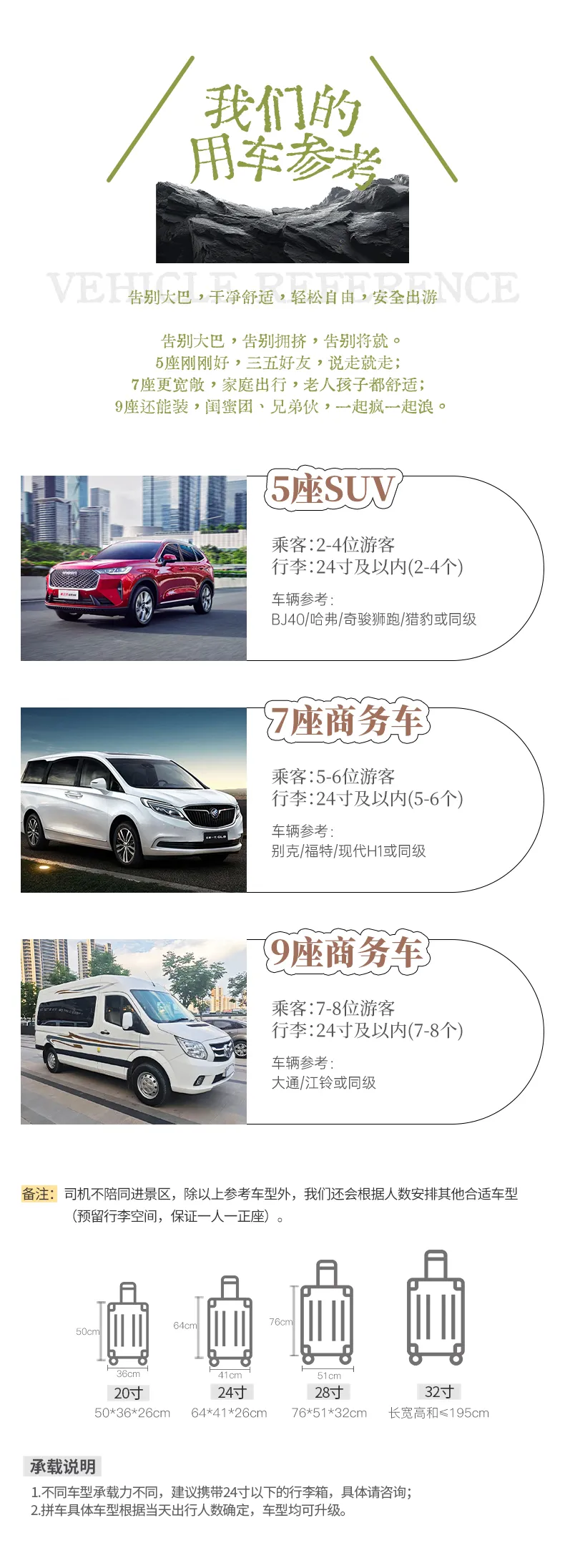 备注:车型承载力有限,携带行李为24寸或以下行李箱。