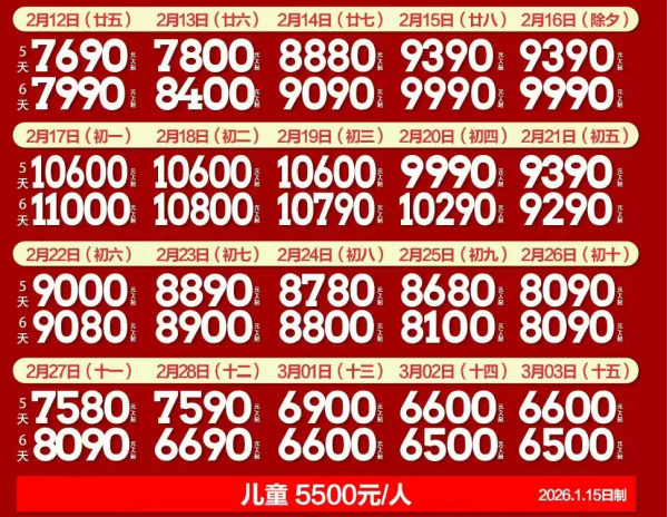 成人 ¥11000 /人, 儿童 ¥5500 /人