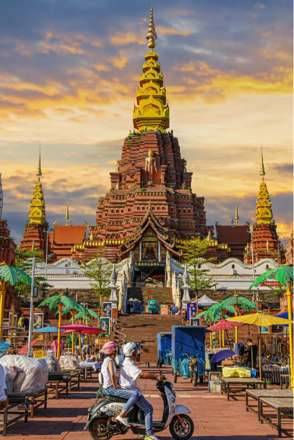 后乘车游览参观西双版纳傣王的皇家寺院——【勐泐大佛寺】(电瓶车 40 元/人,为保证行程统一请客人务必缴纳)(尊享 VIP 通道,不排队零等候)(景区内的商业板块与旅行社无关),佛寺 是在古代傣王朝的皇家寺院“景飘佛寺 ”的原址上修建的,以佛祖释迦牟尼的生平及佛 寺活动为主线,九龙浴佛、景飘大殿、神石、国殿、吉祥大佛等有 500 多座佛寺、200 多座佛塔。而勐泐大佛寺是所有佛寺中最大的,地位也是是至高无上的,是傣家人心目 中的圣地,成为世界南传佛教的文化中心。今日独家资源特别安排:《神石祈福》据贝 叶经记载,这块大石出现在一个雷电交加,风雨大作,大地震动的夜晚,而附近村寨的 居民一直把它当作天降神石祭拜。在第二年,佛祖坐在此石上休憩为四处赶来的百姓讲 经说法。佛祖指着当时澜沧江和流沙河泛滥的坝子,留下预言:将会有一个帕雅(傣王) 管理并繁荣这个地方,佛法将在这里从此光大昌盛……根据时间可观千只孔雀放飞盛 景。参与傣家泼水活动祈福“泼湿一身,幸福终身 ”。